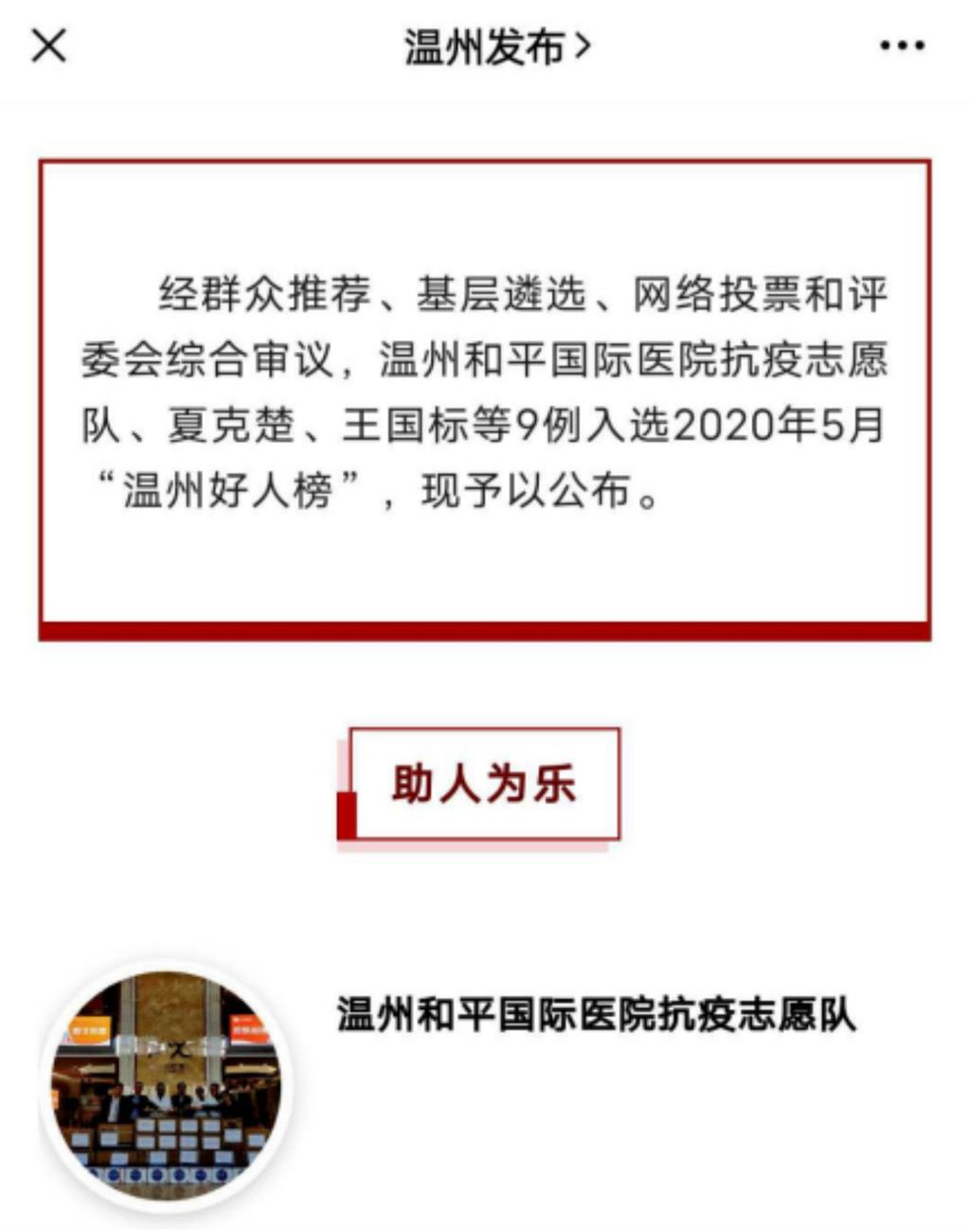 醫院榮獲“溫州好人”集體稱號,醫護人員呂寧寧、侯文杰等獲得感動甌海100人、最美抗疫先鋒等稱號。