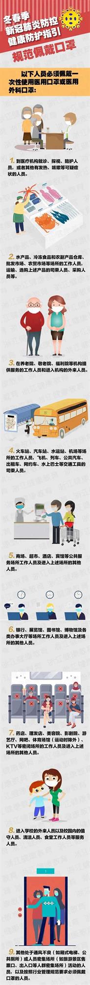 除從事醫(yī)療衛(wèi)生、冷鏈?zhǔn)称贰⒐步煌ā⒐卜?wù)場所等特定行業(yè)和領(lǐng)域工作人員必須佩帶口罩外,浙江還明確要求,到醫(yī)療機(jī)構(gòu)就診、探視、陪護(hù)的人員或者其他有發(fā)熱、咳嗽等可疑癥狀者,進(jìn)入學(xué)校和養(yǎng)老院、敬老院、福利院等機(jī)構(gòu)的外來人員,進(jìn)入商場、超市、酒店、賓館等場所的人員,進(jìn)入銀行、展覽館、圖書館、博物館及各類辦事大廳的人員,進(jìn)入藥店、理發(fā)店、美容院、影劇院、游藝廳、網(wǎng)吧等密閉場所,以及進(jìn)入廂式電梯等通風(fēng)不良場所或旅游景區(qū)售票處等人員密集場所的人員,應(yīng)當(dāng)佩帶口罩。同時(shí),對年老體弱者、慢性疾病患者外出,在公園、夜間集市等戶外人員密集公共場所,以及雖無人員聚集但空間密閉的室內(nèi)公共場所,建議佩帶口罩。
