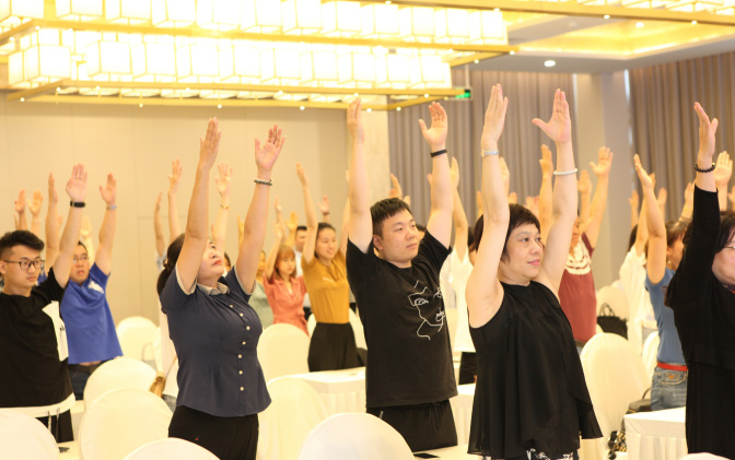 黃鵬現(xiàn)場示范脊柱日常恢復四步操,教會大家“世界上最正確的站立和行走”,全場站立做操。