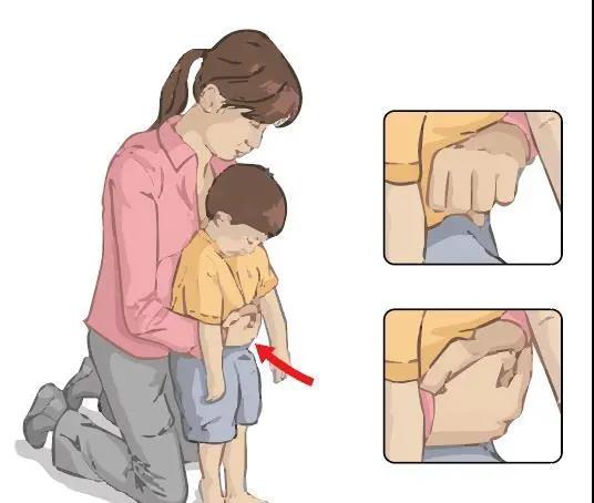 可采用上述用于成人4個步驟的②③④三點,或稍稍彎下腰去,靠在一固定的水平物體上(如桌子邊緣、椅背、扶手欄桿等),以物體邊緣壓迫上腹部,快速向上沖擊。重復(fù)之,直至異物排出。