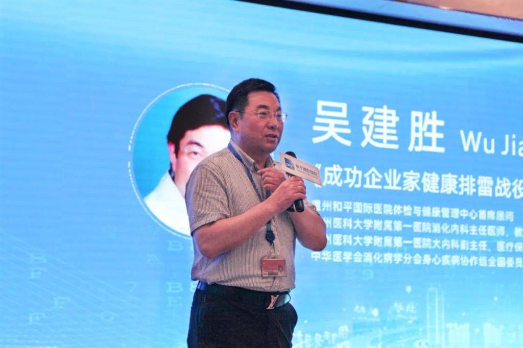 溫州和平國(guó)際醫(yī)院體檢與健康管理中心首席顧問(wèn)、溫州醫(yī)科大學(xué)附屬第一醫(yī)院消化內(nèi)科主任醫(yī)師吳建勝教授,上臺(tái)分享《成功企業(yè)家健康排雷戰(zhàn)役——脂肪肝的前世今生》。